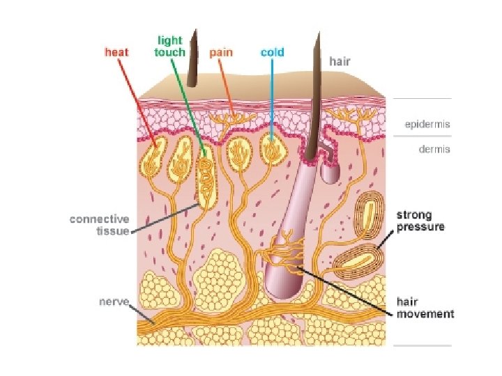 Pain Receptors • Pain Rs are morphologically similar but functionally they are specific 1) Morphology: are specific free nerve endings 2) Highly specific i. e. respond to tissue damage only • Classified according to their adequate stimulus into: a) Mechanical Pain Rs: • Respond to strong mechanical trauma e. g. cutting b) Thermosensitive pain Rs: • Respond to excessive changes in temp (above 45°C and below 10°C). c) Chemical Pain Rs: respond to noxious chemical stimuli. d) Polymodal Pain Rs: respond to a combination of mechanical, thermal, and chemical noxious stimuli