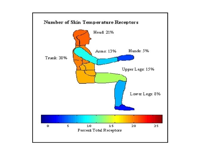 Thermal Sensations Thermal receptors: 2) Distribution: • Distributed in a punctuate fashion where, certain areas of skin contain warm receptors only and others contain cold receptors only with thermally insensitive areas in between. • Cold receptors are greater than warm receptors by about 3 -10 times.