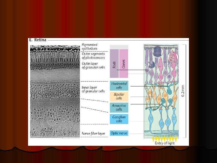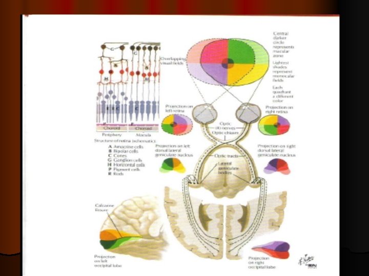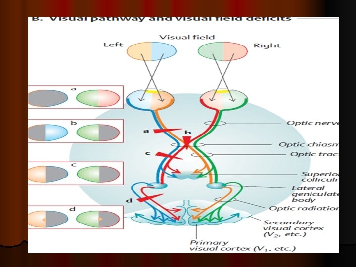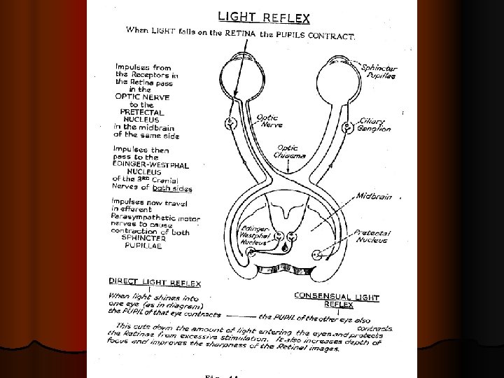 PHYSIOLOGY OF VISION l THE PUPILLARY LIGHT REFLEX l Nervous pathway of the light reflex: Stimulation of the visual receptors(rods &cons)in the retina→optic nerve→optic chiasma→optic tract(i. e. fibers coming from the nasal part of the retina cross in the chiasma to reach the optic tract of the opposite side, temporal fibers go →optic tract of the same side).