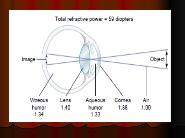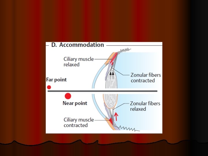 ACCOMMODATION FOR NEAR VISION l 2 -An object at a distance of 6 m infront of the eye will have its focus still on the retina. Again under such condition the eye needs no accommodation. l 3 -An object at distance less than 6 m infront of the eye has its focus behind the retina. In this case accommodation for near vision must take plase to have a clear focused image on the retina.