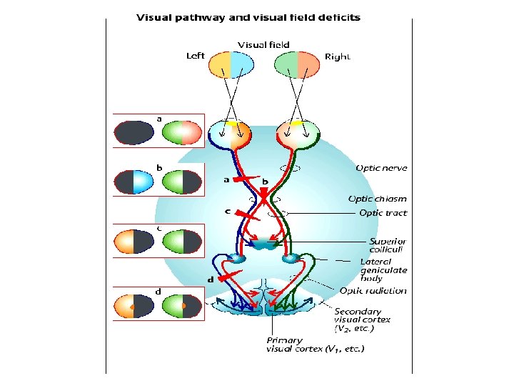 Visual Pathway • Photoreceptors (rods and cones) → bipolar cells (1 st order neuron) → ganglion cells (2 nd order neuron) → their axons form the optic nerve → optic chiasma, where the nasal fibers cross to the opposite side while the temporal fibers pass in the same side • optic tract (ipsilateral temporal fibers + contralateral nasal fibers of retina) → lateral geniculate body (3 rd order neuron) in thalamus • optic radiation → visual cortex in the occipital lobe (1 ry and 2 ry visual areas).