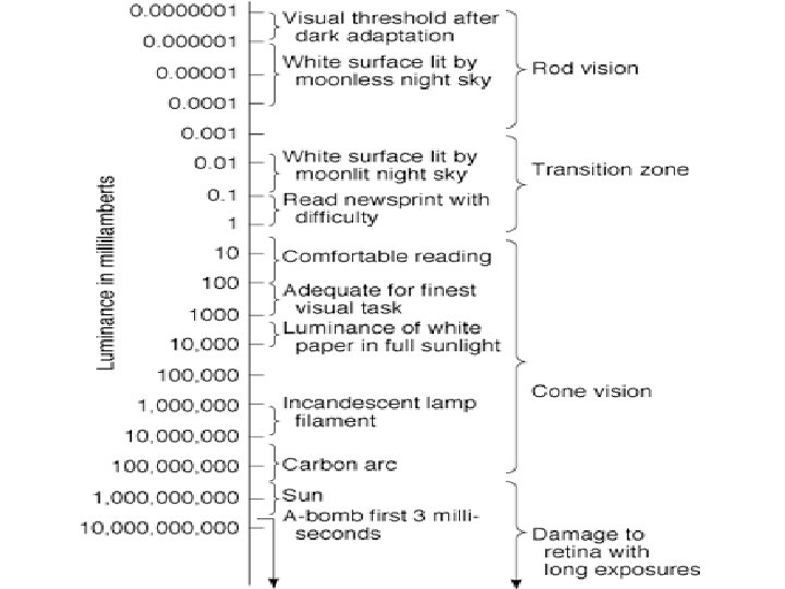 Retinal Adaptation Value of light and dark adaptation The difference between the star light and sun light is about 10 billion times The eye can change its sensitivity as much as 500, 000 -1000, 000 times