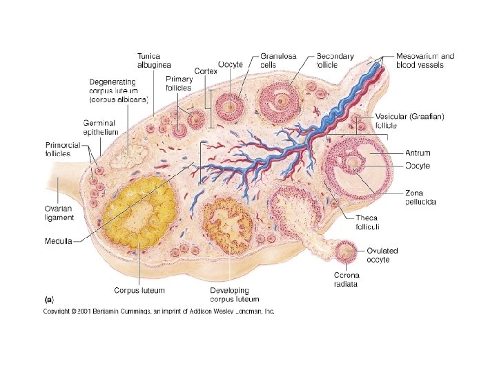 Ovarian and Uterine Cycles The Ovarian Cycle • The ovary is made up of an outer cortex and an inner medulla. • Follicles are in the cortex, each containing an immature oocyte. • A female is born with about 700, 000 follicles. • About 400 will mature as a female usually produces one oocyte per month during her reproductive years. • Oocytes age as a female ages because they are present at birth.