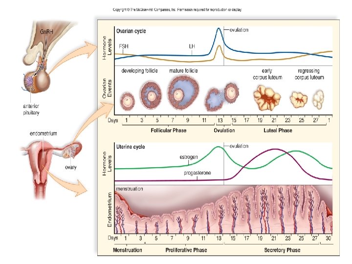 Ovarian and Uterine Cycles Copyright © The Mc. Graw-Hill Companies, Inc. Permission required for reproduction or display. ovulation Hormone Levels Uterine cycle estrogen progesterone Endometrium menstruation Days 1 3 Menstruation 5 7 9 11 Proliferative Phase 13 15 17 19 21 23 25 Secretory Phase 27 30