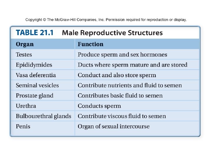 The Male Reproductive System Copyright © The Mc. Graw-Hill Companies, Inc. Permission required for reproduction or display. ureter urinary bladder seminal vesicle prostate gland bulbourethral gland vas deferens urethra