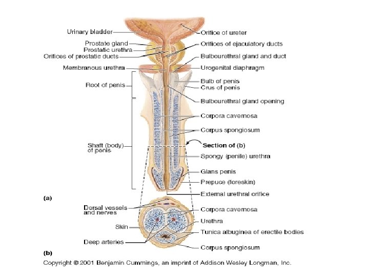 The Male Reproductive System Copyright © The Mc. Graw-Hill Companies, Inc. Permission required for reproduction or display. urinary bladder ureter (cut) seminal vesicle pubic bone ejaculatory duct prostate gland vas deferens bulbourethral gland erectile tissue of penis ureter urinary bladder urethra seminal vesicle penis anus prostate gland vas deferens glans penis foreskin epididymis bulbourethral gland testis vas deferens scrotum urethra