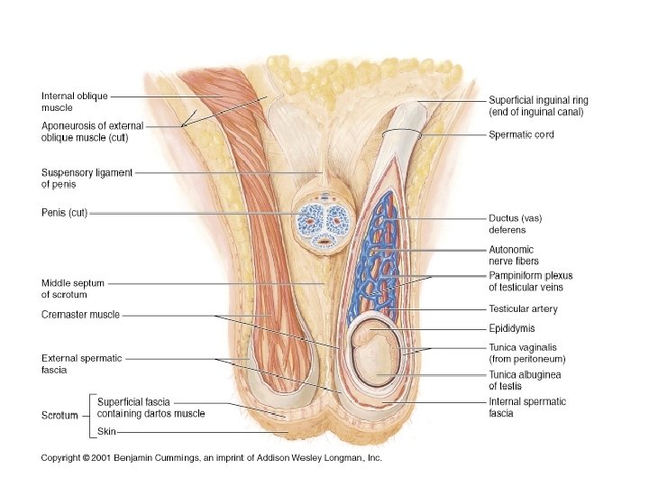 The Male Reproductive System Copyright © The Mc. Graw-Hill Companies, Inc. Permission required for reproduction or display. urinary bladder ureter (cut) seminal vesicle pubic bone ejaculatory duct prostate gland vas deferens bulbourethral gland erectile tissue of penis urethra penis anus vas deferens glans penis foreskin epididymis testis scrotum