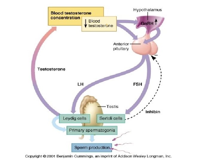 Hormonal Regulation in Males • The hypothalamus has ultimate control of the testes’ sexual function. • Gonadotropin Releasing Hormone (Gn. RH) from the hypothalamus causes the anterior pituitary to release Follicle-Stimulating Hormone (FSH) and Luteinizing Hormone (LH). – FSH targets seminiferous tubules to stimulate sperm production. – LH stimulates interstitial cells of the testes to produce testosterone. – All are regulated by negative feedback.