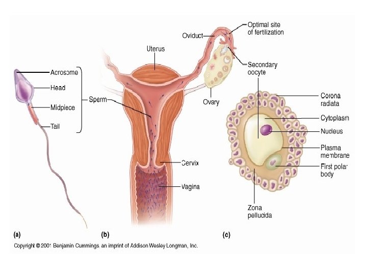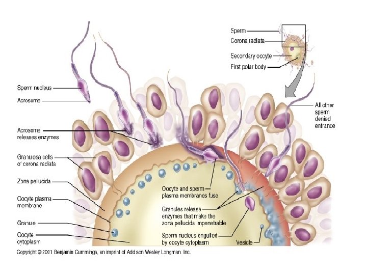 Ovarian Cycle Copyright © The Mc. Graw-Hill Companies, Inc. Permission required for reproduction or display. First polar body sperm meiosis I primary oocyte (46 chromosomes) Second polar body meiosis II secondary oocyte (23 chromosomes) zygote Sperm nucleus and egg nucleus fuse; zygote with 46 chromosomes results.