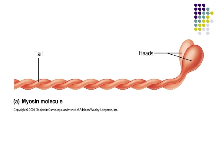 Myosin l l Myo- muscle Motor protein of the myofibril Thick filament Attaches to the M-line l l l Heads point towards Z-lines Myosin heads are clustered at the ends of the filament Myosin tails are bundled together