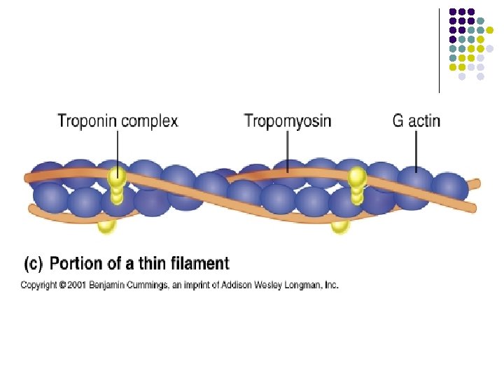 Actin l Thin Filament l l Attached to Z-lines Globular protein l l G-Actin Has binding site for myosin head Forms a Cross-Bridge when myosin binds to G-actin Five Actin proteins surround the myosin in 3 -D pattern