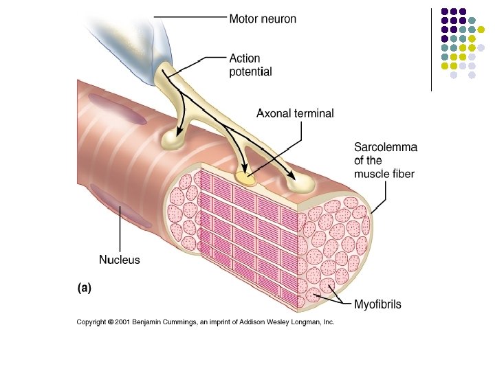 Events at Neuromuscular Junction l l Ach binds to cholinergic receptors on the motor end plate Na+ channels open l l Na+ influx exceeds K+ efflux across the membrane End-Plate Potential (EPP) l EPP reaches threshold and initiates a muscle action potential