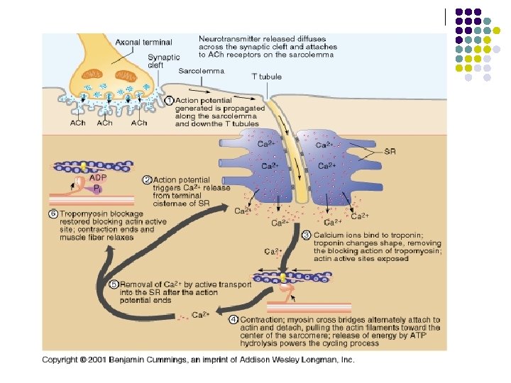 Events at Neuromuscular Junction l Action Potentials move down the membrane l l K+ builds up in the t-tubules Depolarization occurs l l Calcium gates on the SR opens Calcium diffuses into the cytoplasm of the cell