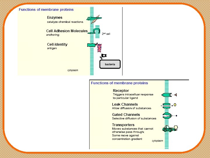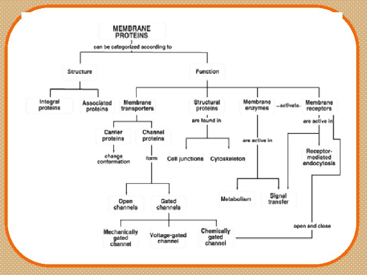 MEMBRANE PROTEINS • Each cell: 10 -50 different types of membrane proteins. • Proteins determine membrane’s specific functions. • Cell membrane & organelle membranes each have unique collections of proteins. Peripheral proteins (Cell surface identity marker (antigens)) • present either to the outside or inside of the cell. • Some of them are anchored to the membrane by covalent bonding. • Others held non-covalently that can be disrupted by gentle movement or change in p. H. • Include enzymes and binding proteins that anchor cell to membrane. Integral proteins (Transmembrane proteins) - Tightly bound to phospholipid bilayer. - Present within the matrix of the membrane.