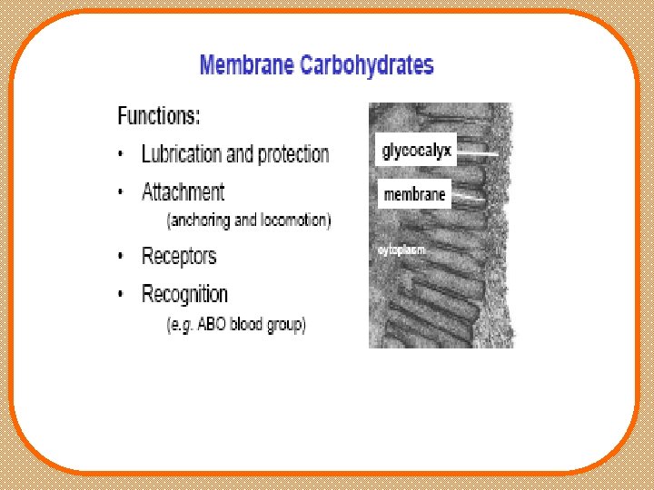Membrane carbohydrates v Play a key role in cell-cell recognition (The carbohydrate chains of glycolipids and glycoproteins serve as the “fingerprints” of the cell). v Glycolipids and glycoproteins vary from species to species and even from cell to cell in the same individual. – ability of a cell to distinguish one cell from another. – important in organ & tissue development. – basis for rejection of foreign cells by immune system. – Person’ particular blood group is due to the presence of particular glycoproteins in the membrane of RBC.