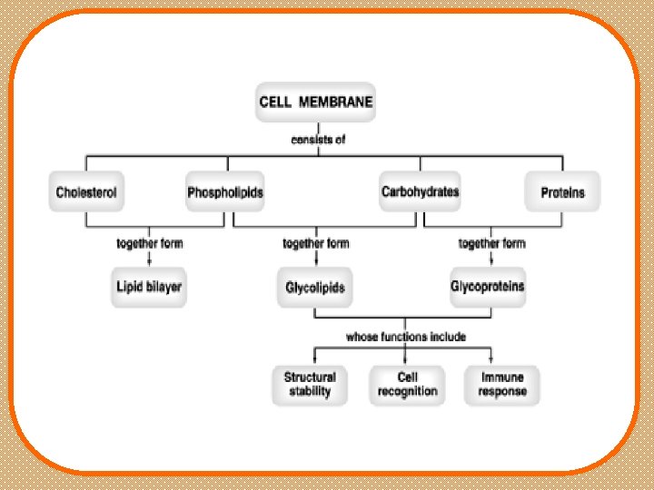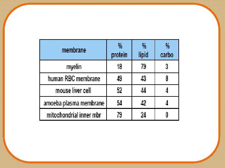 Other lipids in plasma membrane • GLYCOLIPIDS: Phospholipid molecule attached with a carbohydrate chain straight or branched to its hydrophilic head. • CHOLESTEROL: lipid found in animal plasma membranes which reduces the permeability to most biological molecules. • it regulates membrane fluidity over the range of physiological temperatures. • cholesterol also functions in intracellular transport, cell signaling and nerve conduction. • cholesterol has also been implicated in cell signaling processes, assisting in the formation of lipid rafts in the plasma membrane. • In many neurons a myelin sheath, rich in cholesterol since it is derived from compacted layers of Schwann cell membrane, provides insulation for more efficient conduction of impulses. • Cholesterol present between the fatty acids chains, binds with OH side to the phosphate of lipid by H-bonding.