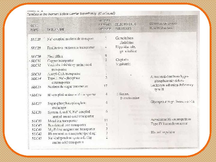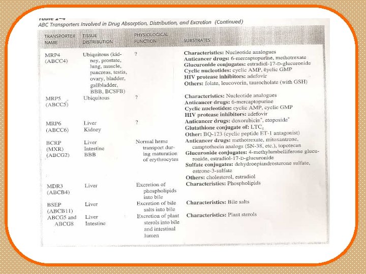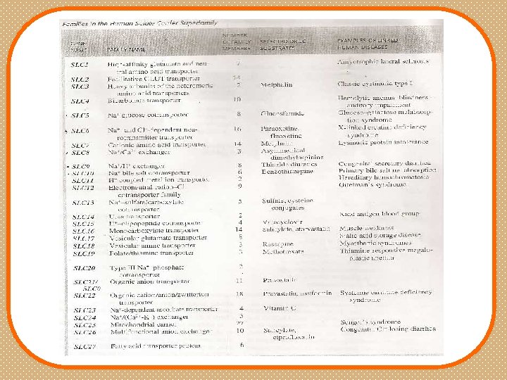 Transport of drugs • 2 super families. • ABC (ATP binding cassette)-active • SLC (solute carrier)-facilitated ABC: • Active transport • Divided into 7 subclasses (or) families (A-G) These include 1) P-gp (encoded as ABCB 1/MDRI). 2) Cystic Transmembrane CFTR regulator(ABCC 7). SLC: Ø Facilitated Transport. Ø Ion coupled. Ø 43 SLC Families, 300 Transporters. Ø Seratonin SERT, (SLC 6 A 4), Dopamine Transporters, DAT(SLC 6 A 3).