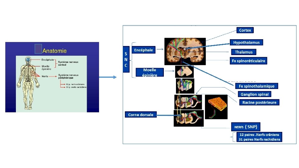 2. Au niveau de la ME 2. 2. Voies spinales ascendantes: Ø Les neurones nociceptifs de la corne dorsale spinale décussent au niveau de la commissure grise ventrale et gagnent le cordon antérolatéral controlatéral de la M. E. Ø Le message nociceptif emprunte des voies ascendantes jusqu’au thalamus Ø 2 voies principales q Voie de la composante sensorielle discriminative de la douleur (emplacement, intensité, nature de la douleur): faisceaux spinothalamique. q Voie de la composante émotionnelle, affective de la douleur (caractère désagréable, déclenche la fuite, la défense): voie spinoréticulaire.