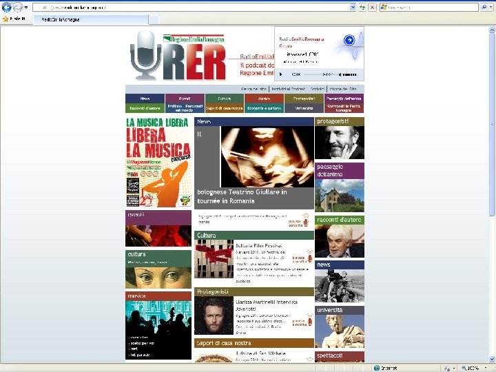 RER - RADIOEMILIAROMAGNA www. radioemiliaromagna. it • • E’ la prima radio sul web di una Regione italiana che trasmette in podcasting Aggiornata sulle notizie dal mondo grazie ai giovani che hanno frequentato Reporter Sul sito si trovano pubblicati i testi di molte rubriche facilitando la comprensione a chi la segue dall’estero e costituendo un valido aiuto nello studio della lingua italiana E’ possibile ascoltare la radio anche via etere attraverso convenzioni con radio estere, in collaborazione con le nostre associazioni all’estero Ha vinto, tra l’altro, il “Best Cross Media Project” assegnato dal Bardi Web Award 2006, per la “rilevanza sociale” della radio, che consente di rafforzare i legami con gli emiliano-romagnoli e gli italiani nel mondo in un’ottica di comunicazione “cross-mediale” utilizzando diversi mezzi.