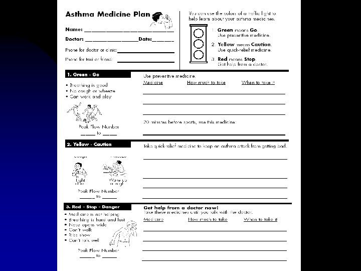 Piano di gestione individuale dell’asma Obiettivi: Assumere i farmaci correttamente Conoscere la differenza tra farmaci di “pronto soccorso” e farmaci “di fondo” Evitare i fattori scatenanti Controllare l’asma riconoscendone i sintomi e se possibile utilizzando misure di flusso Riconoscere i segni suggestivi di peggioramento dell’asma e predere gli adeguati provvedimenti Fornire un piano terapeutico personalizzato Fornire le indicazioni per un appropriato ricorso alle cure mediche