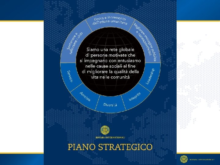 Sostenere e rafforzare i club - Obiettivi • Incoraggiare i club a partecipare a varie attività di servizio • Promozione della diversità dell’effettivo • Miglioramento del reclutamento e della conservazione dell’effettivo • Promuovere innovazione e flessibilità nel club • Incoraggiare la pianificazione