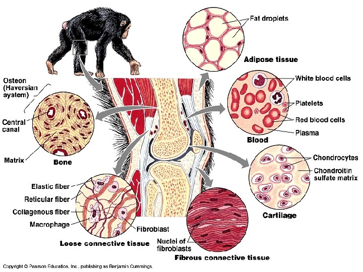 • • • Tissues, II 2 - Connective: bind and support other tissues; scattered cells through matrix; 3 kinds: A-Collagenous fibers (collagen protein) B-Elastic fibers (elastin protein) C-Reticular fibers (thin branched collagen fibers) Loose connective tissue: binds epithelia to underlying tissue; holds organs 1 -Fibroblasts- secretes extracellular proteins 2 -Macrophages- amoeboid WBC’s; phagocytosis 3 Adipose tissue- fat storage; insulation Fibrous connective tissue: parallel bundles of cells 1 -Tendons- muscles to bones 2 -Ligaments- bones to bones; joints (BOBOLI) Cartilage: collagen in a rubbery matrix (chondroitin); flexible support Bone: mineralized tissue by osteoblasts Blood: liquid plasma matrix; erythrocytes (RBC’s) carry O 2; leukocytes (WBC’s) immunity