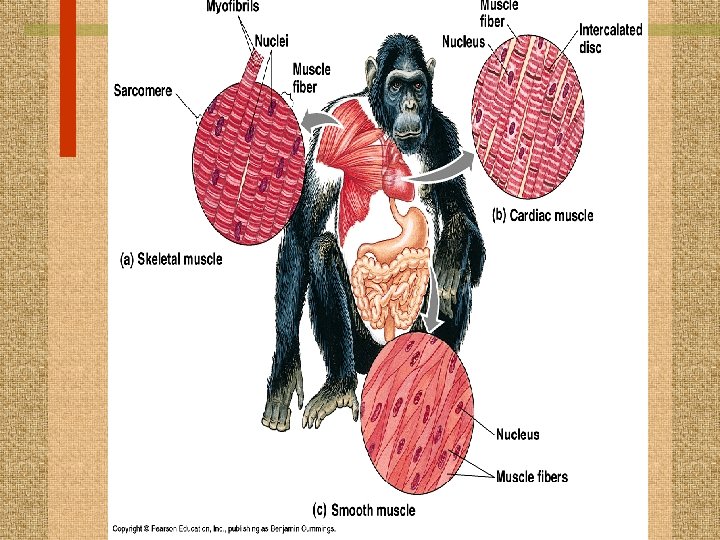 Tissues, IV • • 4 - Muscle: capable of contracting when stimulated by nerve impulses; myofibrils composed of proteins actin and myosin; 3 types: A- Skeletal: voluntary movement (striated) B- Cardiac: contractile wall of heart (branched striated) C- Smooth: involuntary activities (no striations)