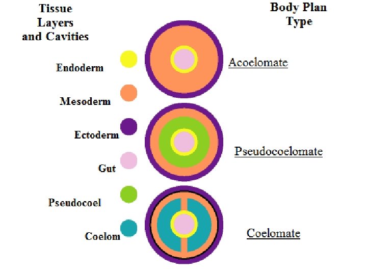 1. Acoelomate, in which no coelomic cavity exists. Find an animal in your textbook or in the lab that is an example of this body plan. 2. Pseudocoelomate, in which a coelom exists, but it is lined by mesoderm only on the body wall, not around the gut. What is an example of a pseudoceoleomate animal? 3. Coelomate (or Eucoelmate, or “True” Coelom), in which the coelom is lined both on the inside of the body wall and around the gut by mesoderm. Animals with a true coelom also have mesenteries, which suspend the body organs within the coelom.