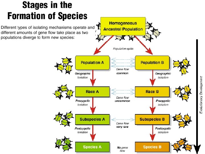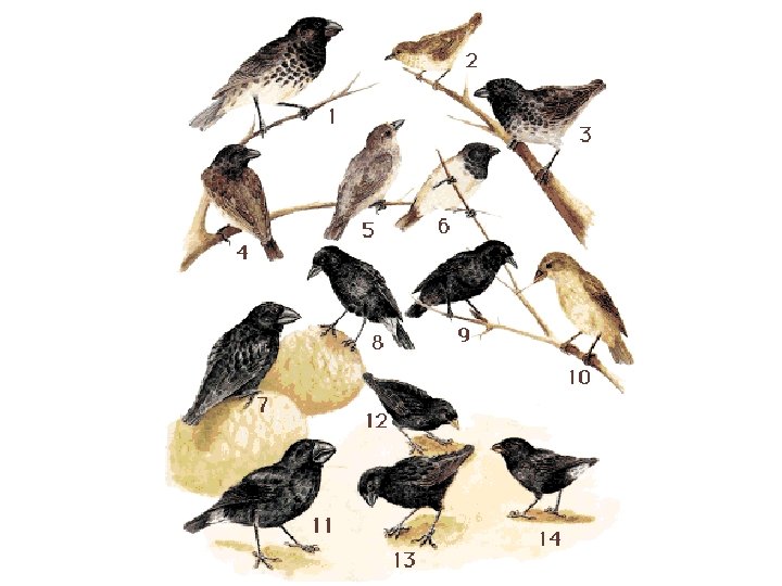 • Birds moving to a new island will adapt to the different environment there • If some old birds move back with the old birds – because of reproductive isolation (like behavior – choosing mates with similar beak size) the two birds won’t mate. • Because of ecological competition they will tend to become more different each other so they compete