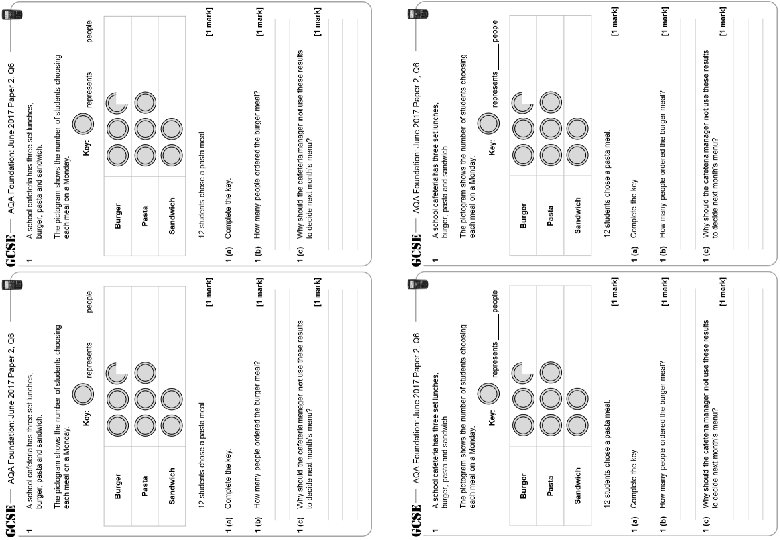 AQA Foundation: June 2017 Paper 2, Q 6 1 A school cafeteria has three set lunches, burger, pasta and sandwich. The pictogram shows the number of students choosing each meal on a Monday. Key: represents ______ people Burger Pasta Sandwich 12 students chose a pasta meal. 1 (a) Complete the key. 1 (b) How many people ordered the burger meal? 1 (c) Why should the cafeteria manager not use these results to decide next month’s menu? [1 mark]