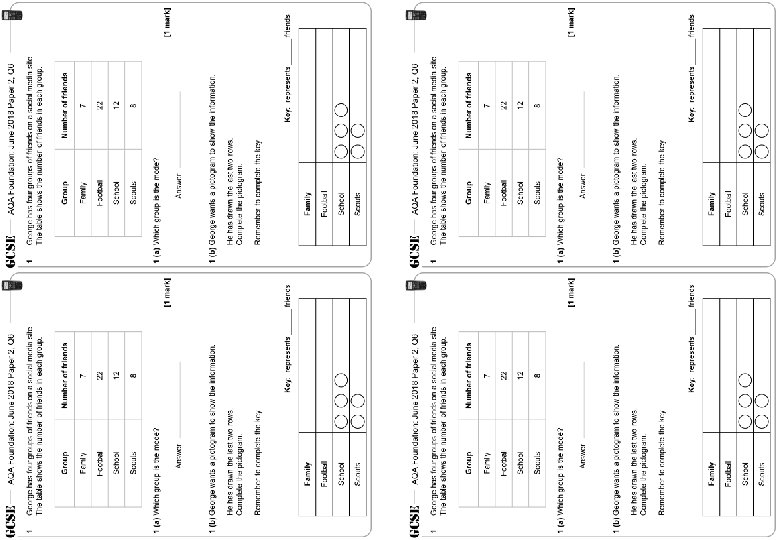 AQA Foundation: June 2018 Paper 2, Q 6 1 George has four groups of friends on a social media site. The table shows the number of friends in each group. Group Number of friends Family 7 Football 22 School 12 Scouts 8 1 (a) Which group is the mode? [1 mark] Answer 1 (b) George wants a pictogram to show the information. He has drawn the last two rows. Complete the pictogram. Remember to complete the key. Key: represents ______ friends Family Football School Scouts