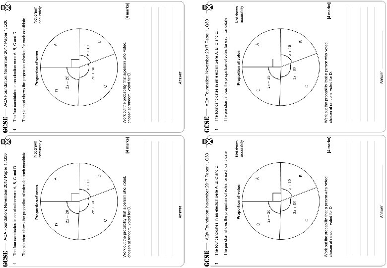 AQA Foundation: November 2017 Paper 1, Q 30 1 The four candidates in an election were A, B, C and D. The pie chart shows the proportion of votes for each candidate. Not drawn accurately Proportion of votes A D B C Work out the probability that a person who voted, chosen at random, voted for D. Answer [4 marks]