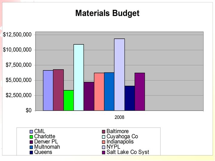 2010 -2011 850, 000 residents Operating Budget $23 M Materials Budget $1. 7 M 7 M Circulation 1. 2 M volumes 20 Library Locations Linda Raymond Materials Manager at CML since 2003 • Centralized Selection • Outsource cataloging and processing with B&T • Began Sharing all items 1/2007 • Population size 850, 000 + 2