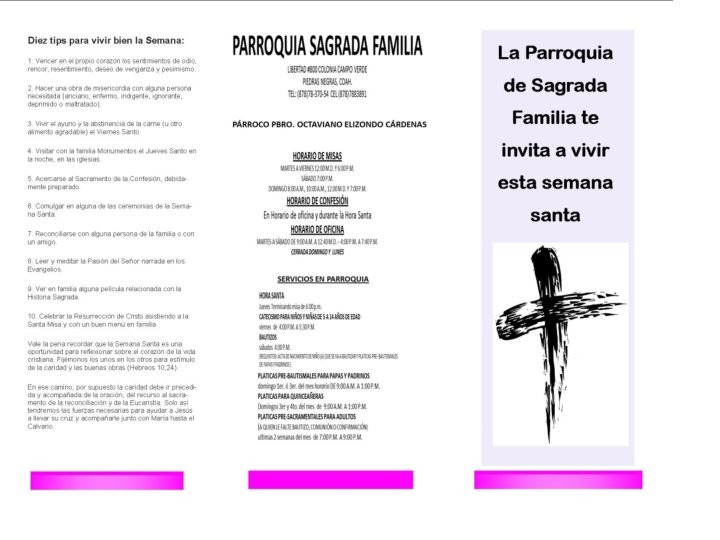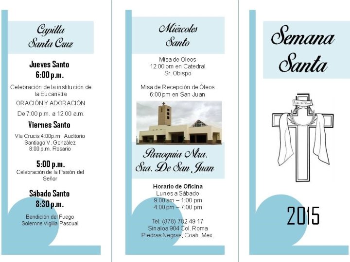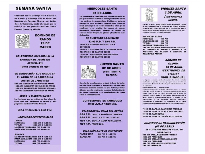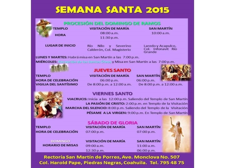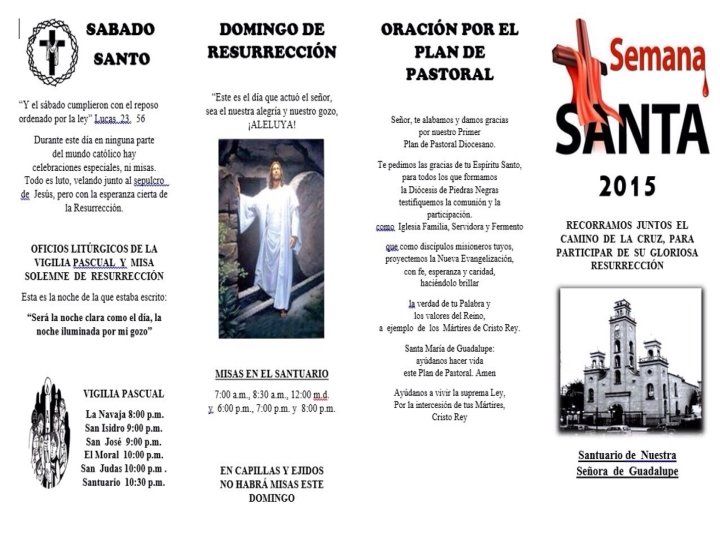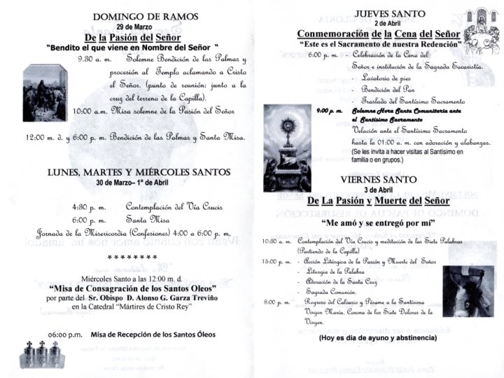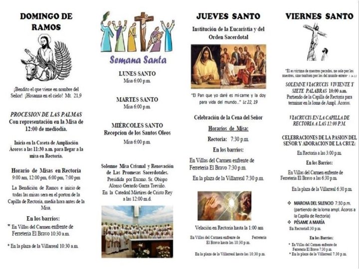 SAGRADO CORAZÓN DE JESÚS DE LA COLONIA BRAVO • JUEVES SANTO -CAPILLA DE SAN FRANCISCO COL. BUENOS AIRES: 4: 00 P. M. -CAPILLA DEL PERPETUO SOCORRO COL. MORELOS: 4: 00 P. M. -CAPILLA DEL ESPIRITU SANTO COL. PRESIDENTES : 5: 00 P. M. -PARROQUIA DE LA COL BRAVO : 7 : 00 PM • VIERNES SANTO -VÍA CRUCIS: 10: 00 A. M. (PARTIENDO DE LA CAPILLA DEL ESPIRITU SANTO DE LA COL. PRESIDENTES PARA TERMIANR CON CELEBRACIÓN EN LA PARROQUIA SAGRADO CORAZÓN A LAS 12: 00 M. D. ) -PESAME A LA VIRGEN: 8: 00 P. M. PARROQUIA SAGRADO CORAZÓN • SABADO SANTO BENDICION DEL FUEGO: -CAPILLA DEL PERPETUO SOCCORRO COL. MORELOS: 7: 00 P. M. -CAPILLA SAN FRANCISCO COL. BUENOS AIRES 8: 00 P. M. -CAPILLA ESPIRITU SANTO COL. PRESIDENTES: 7: 00 P. M. -PARROQUIA SAGRADO CORAZÓN: 8: 00 P. M.