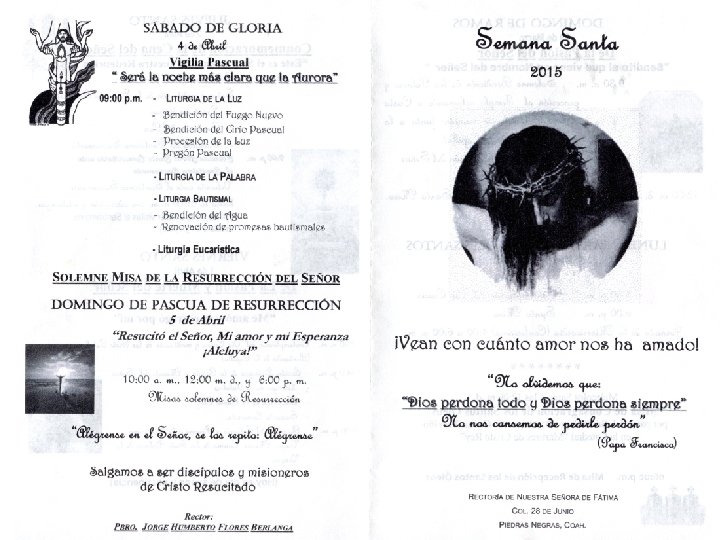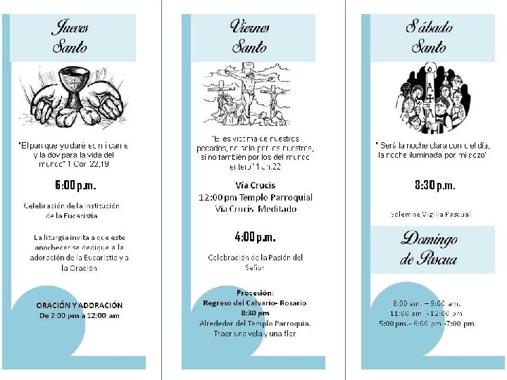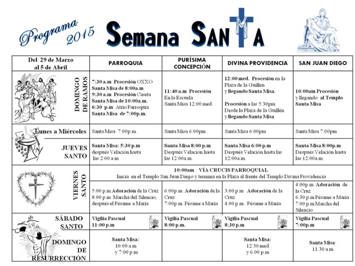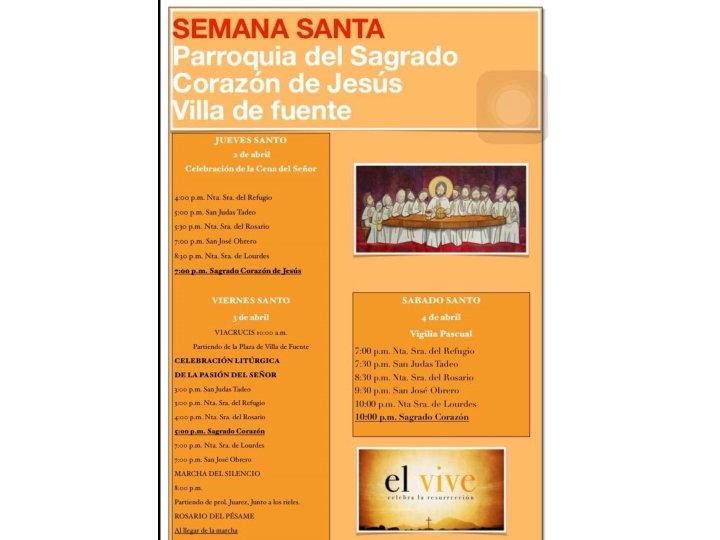 NUESTRA SEÑORA DEL PERPETUO SOCORRO • MIERCOLES 1 DE ABRIL MISA RECEPCIÓN DE OLEOS: 7: 00 P. M. • JUEVES 2 DE ABRIL -CELEBRACION DE LA ULTIMA CENA Y LAVATORIO DE PIES 7: 30 P. M. -CENA JUDIA DESPUES DE MISA: 8: 30 P. M. -VELACION DEL SANTISIMO: DE 8: 30 P. M. A 12: 00 A. M. • VIERNES 3 DE ABRIL -VIA CRUCIS VIVIENTE 9: 30 A. M. PARTIRAN DE LA PARROQUIA -CELEBRACION PASION DEL SEÑOR: 5: 00 P. M. -PROCESION DEL SILENCIO: 8: 30 P. M. (SALIENDO DE LA CAPILLA DE LA RESURRECIION PARA LLEGAR AL ROSARIO DEL PESAME EN LA PARROQUIA) • SABADO 4 ABRIL -BENDICION DEL AGUA 11: 00 A. M. -CELEBRACION SOLEMNE DE PASCUA 8: 30 P. M. • DOMINGO 5 DE ABRIL HORARIOS DE MISA: -PARROQUIA 9: 00 A. M. , 12: 00 M. D. , Y 7: 00 P. M -CAPILLA SAN MIGUEL ARCANGEL: 10: 30 A. M.