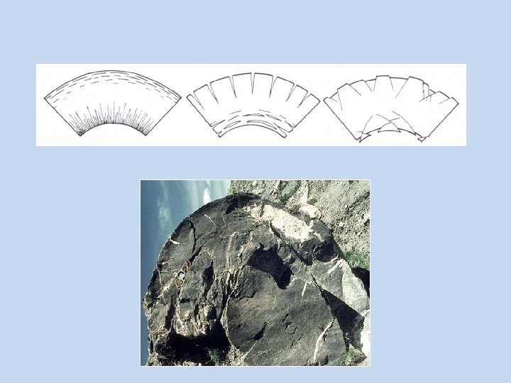 A "type 2" fold interference pattern which generates rather strange "winged" or "butterfly" outcrop patterns. Looking down on the outcrop, this pattern results from a recumbent first phase of folding (with hinges trending up and down the screen) followed by upright folds trending L-R. Loch Monar, Scotland. A "type 3" fold interference pattern which generates tongue-shapes. These shapes original from near-recumbent axial surfaces being refolded by upright folds, but with hinge lines nearly parallel.