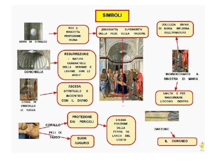 LA PALA DI BRERA o SACRA CONVERSAZIONE • Rapporto di linee curve • Conchiglia con uovo di struzzo: perfezione, verginità e creazione • Punto di fuga: occhi della Madonna • Luce uniforme • Sentimento che si prova difronte alla perfezione della matematica • Dettagli: arte fiamminga e luce (bagliori) • Chiesa: simile a Sant’ Andrea di Leon Battista Alberti