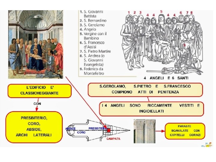 LA PALA DI BRERA o SACRA CONVERSAZIONE • Intento votivo e celebrativo: 1472 (nascita dell’ erede e morte della moglie e successo militare su Volterra) • Emblema politico e dinastico • Sacra conversazione all’ interno di una chiesa