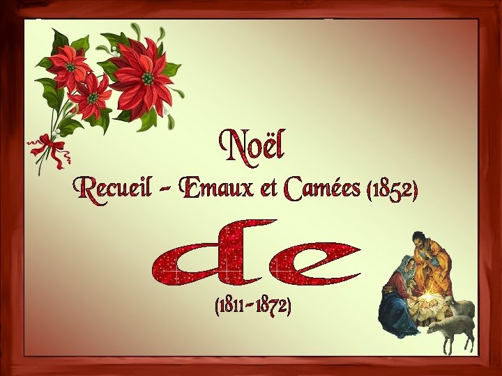 La neige au chaume coud ses franges, Mais sur le toit s'ouvre le ciel Et, tout en blanc, le chœur des anges Chante aux bergers : « Noël ! » Théophile Gautier. (1811 -1872)