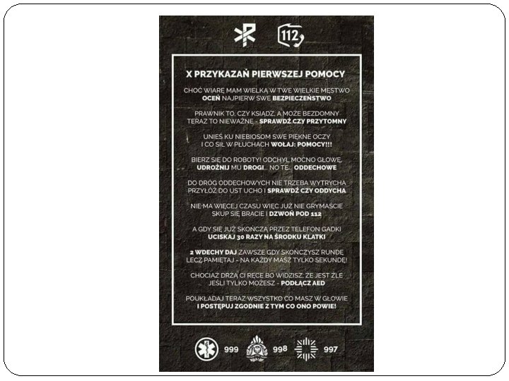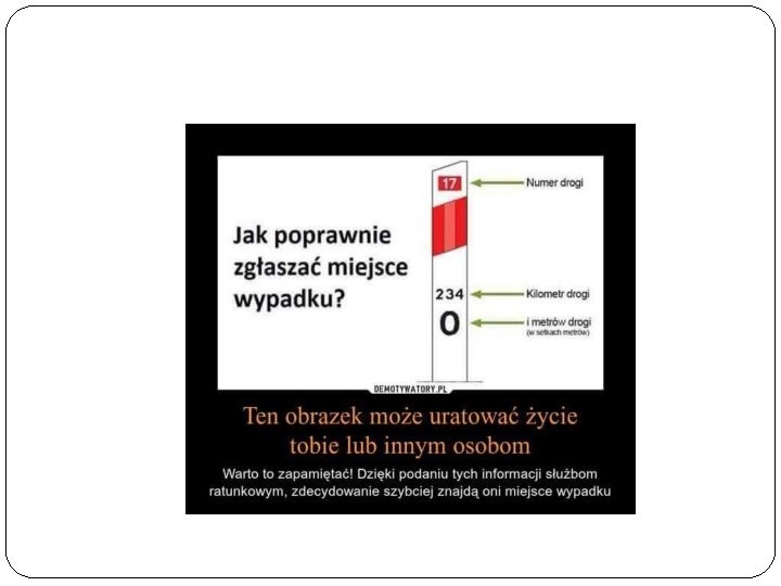 Wzywanie pomocy Miejsce zdarzenia ( adres, punkty orientacyjne) Co się stało? Kto potrzebuje pomocy? ( imię, nazwisko, wiek, płeć) Ilu jest poszkodowanych? W jakim są stanie? Czy udzielono pierwszej pomocy? Dane wzywającego + nr tel. Czekaj na potwierdzenie przyjęcia wezwania!!!! Pamiętaj: nie odkładaj pierwszy słuchawki!