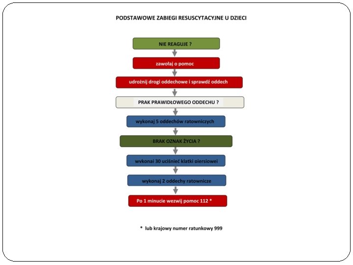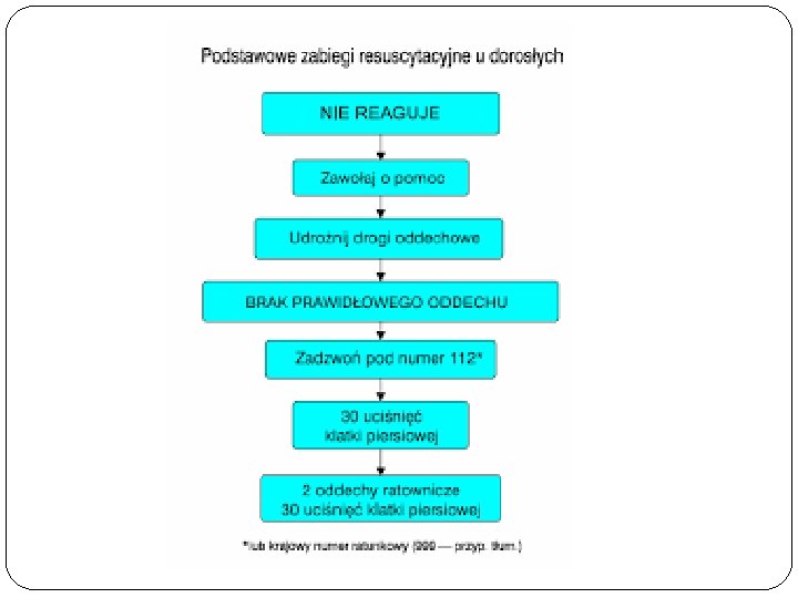 Utrata przytomności – schemat postępowania �Sprawdź bezpieczeństwo �Sprawdź przytomność �Zawołaj pomoc �Udrożnij drogi oddechowe �Sprawdź oddech �Wezwij ZRM �Ułóż w pozycji bezpiecznej