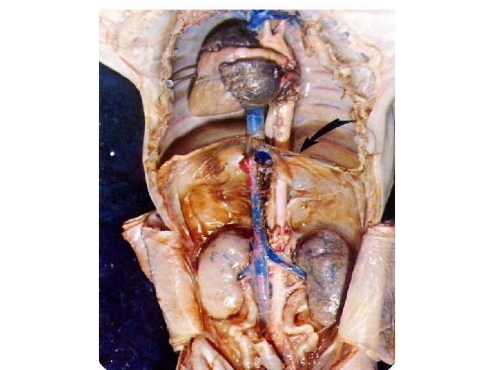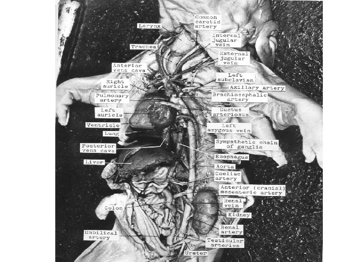 Other Closely Associated Structures • Ventral to the dorsal aorta is a thick, white tube, the esophagus, which leads from the pharynx through the diaphragm and into the stomach. Along the esophagus run 2 main branches of the vagus nerve. The vagus nerves innervate thoracic and abdominal viscera. Another pair of nerve cords, bearing a series of small swelling along their course, may be seen behind the peritoneum dorsal and lateral to the aorta on either side. These are the main trunks of the sympathetic nervous system.