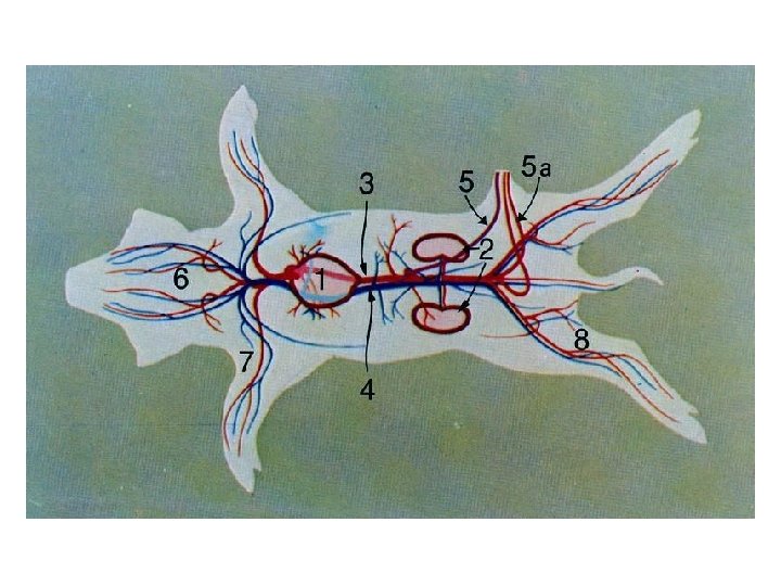 Arteries • Two large arterial trunks leave the ventricles anteriorly. The most ventral trunk is the pulmonary trunk, which transport blood directly to the lungs. This artery will be traced later. The other trunk, the aortic arch, gives off 2 main arteries, which send branches to the fore legs, shoulder, neck, and head regions. Lift the left lung to trace the aortic arch dorsally. It turns posteriorly and runs along the dorsal midline as the dorsal aorta and eventually delivers blood to the entire posterior part of the body.