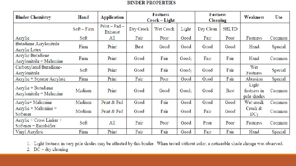 Types of Binders 1. Vam – Acrylic Base Binders 2. Styrene – Acrylic Base Binders 3. Pure Acrylic Base Binders Check Points Should be as below a. % of Solid Content b. % of Active content c. Film on Glass plate d. Tg of Binder e. Nature ( Anionic /Non-ionic )