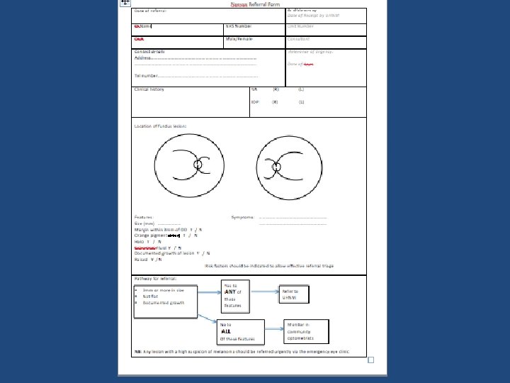 Community Referral Guidelines Lesions over 3 mm diameter Any lesion with documented growth Any raised lesion, regardless of size Risk factors should be indicated to allow effective referral triage • Any lesion with a high suspicion of melanoma should be referred urgently via the emergency eye clinic • •
