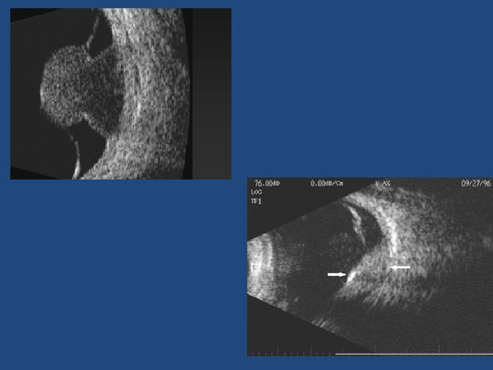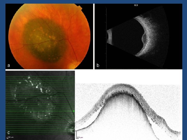 Ultrasound vs OCT-EDI • OCT-EDI measurements are approximately 50% less thick than USB measurements (i. e. a 3 mm lesion on USB will measure 1. 5 mm on OCT-EDI) • USB cannot detect/measure lesions <0. 75 mm thick – these can be measured with OCT-EDI • OCT-EDI less helpful as tumours enlarge (>3 mm) • The lesion must be at least 1. 5 mm thick on USB measurement before meaningful comments on echogenicity can be made • USB echogenicity is determined by the density of cellularity of the tissue comprising the lesion (the denser the tissue the lesser the internal reflectivity) • OCT-EDI appearance is determined by the amount of pigment in the lesion and does not correlate to ultrasonic internal reflectivity • OCT-EDI offers a better estimate of the true dimensions of the lesion compared to USB