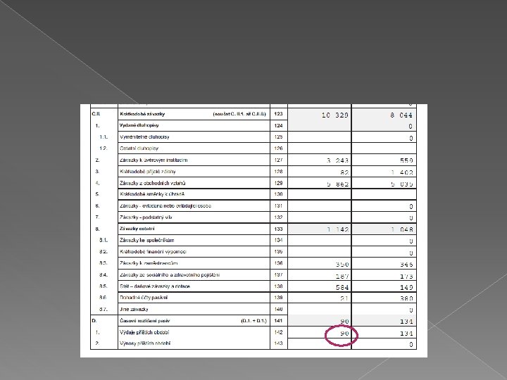 Dohadné položky pasivní � Na konci roku N – telefon 50 - DPP – Závazky + 50 � Na začátku roku dalšího: odhad podhodnocen N – telefon DPP - Závazky 1) 50 PZ 50 Peníze 2) 55 Dodavatelé 2) 55 1) 55