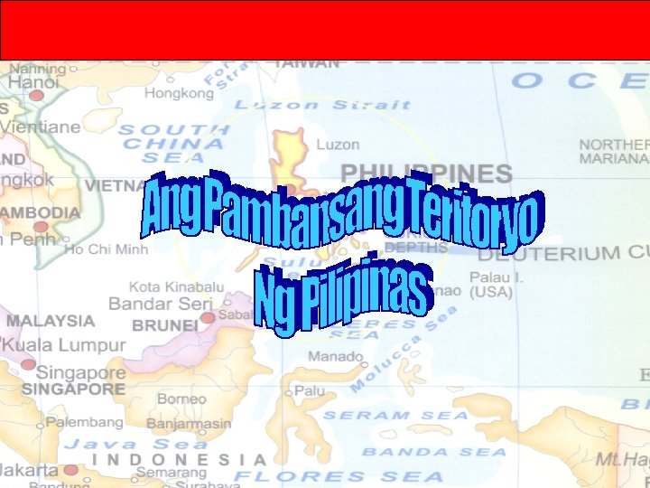 Artikulo I ng Saligang Batas ng 1987 Ang pambansang teritoryo ay binubuo ng kapuluan ng Pilipinas. kasama rito ang lahat ng mga pulo at mga karagatang nakapaloob dito. Kasama rin ang lahat ng iba pang mga teritoryo na nasa ganap na kapangyarihan o hurisdiksyon ng Pilipinas. Binubuo ito ng kalupaan, katubigan, at himpapawirin. Kasama na rin ang dagat teritoryal, ang ilalim ng dagat, ang kailaliman ng lupa, ang mga kalapagang insular, at iba pang pook submarina nito. Ang dagat at karagatang nakapaligid, nakapagitan at nag-uugnay sa mga pulo ng kapuluan maging anu man ang lawak ng dimensyon, ay bahagi ng panloob na dagat at karagatan ng Pilipinas.