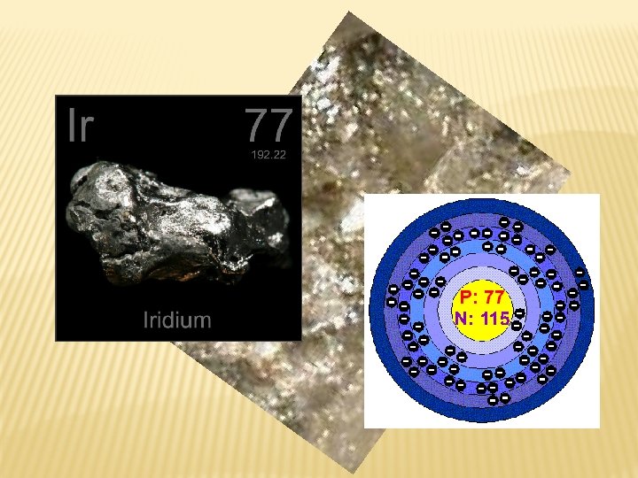 • Se descubre en 1803 por S. Tennant. • Se obtiene como subproducto de la minería del níquel. • Densidad muy elevada 22. 65 g/ cm 3 a 20°C. • No es atacado por ácidos pero si por sales como Na. Cl, Na. CN, Na. OH. • Se emplea en aleaciones de alta resistencia, es endurecedor de platino, se utiliza para fabricar piezas de larga duración en motores de avión con iridio aleado y en tuberías para aguas profundas se usa una aleación especial de titanio-iridio.