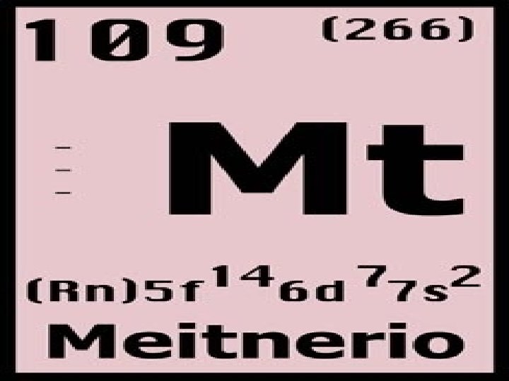 INFORMACION GENERAL Información general Nombre, símbolo, número Meitnerio, Mt, 109 Serie química Metales de transición Grupo, período, bloque 9, 7, d Masa atómica 268 u Configuración electrónica [Rn] 7 s 2 5 f 14 6 d 7 (calculado) Electrones por nivel 2, 8, 18, 32, 15, 2 (predicción) Propiedades atómicas Radio covalente 129 (estimado) pm Estado(s) de oxidación 3, 4, 6[ (suposición basada en el iridio) Propiedades físicas Estado ordinario Probablemente sólido Varios Estructura cristalina Cúbica centrada en las caras